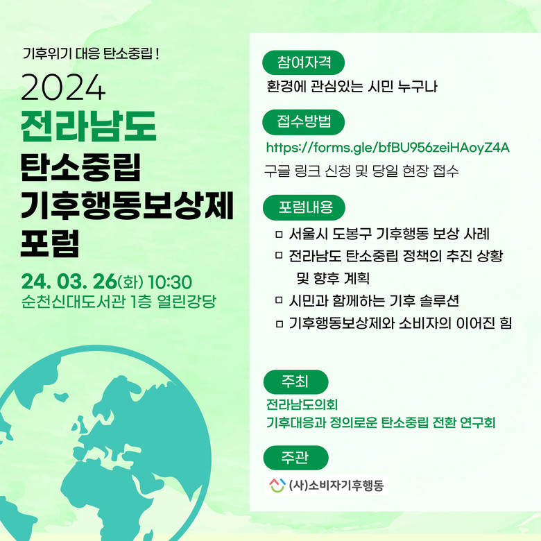 [전남 세계타임즈=우덕현 기자] 전남도의회 ‘기후대응과 정의로운 탄소중립 전환 연구회(대표위원 주종섭)’가 주최하고 (사)소비자기후행동이 주관하는 2024 전라남도 탄소중립 기후행동보상제 포럼이 3월 26일 순천 신대도서관 열린강당에서 개최된다.