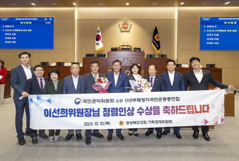 [경북 세계타임즈=한윤석 기자] 경상북도의회 기획경제위원장 이선희 의원(국민의힘, 청도)이 24년 10월 10일 국민권익위원회 소관 (사)부패방지국민운동총연합으로부터 지역사회 내 청렴성과 투명성 확산에 기여한 공로를 인정받아 청렴인상을 수상했다. 이는 경상북도의회가 부패방지의지와 부패방지노력의 결과로 국민권익위원회가 주관한 2023년 지방의회 종합청렴도 평가에서 17개 시도의회 중 1등급 달성에 이은 쾌거이다.