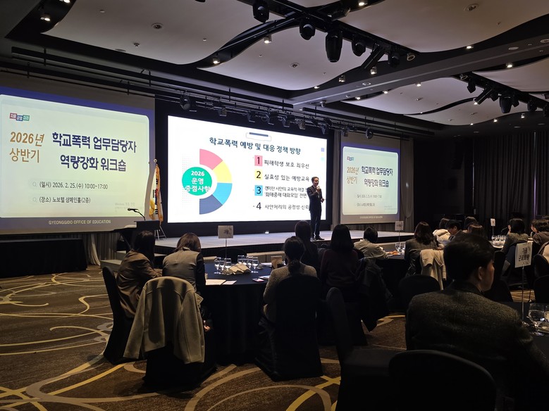 [경기도 세계타임즈=송민수 기자] 경기도교육청(교육감 임태희)이 25일 수원 노보텔에서 학교폭력의 교육적 회복과 사안 처리 신뢰도 제고를 위한 ‘2026년도 1차 학교폭력 업무 담당자 역량 강화 워크숍’을 개최했다.