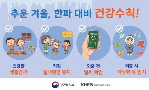 겨울철 한파 대비 건강 수칙으로는 △실내 적정 온도(18~20℃) 및 습도(40~60%) 유지 △ 외출 전 체감온도 확인 △ 외출 시 방한용품 착용 등이 있다.