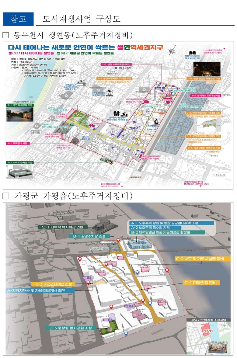 사업 내용을 살펴보면 성매매 집결지로 인한 사회·환경적 문제 누적으로 정비가 필요하던 동두천시 생연동은 성매매 집결지 철거 후 공원과 주차장 등 생활 사회간접자본(SOC)을 조성한다. 맹지 해소 도로개설사업 등 환경개선사업과 이와 연계한 노후주택 리모델링 등 노후주거지정비 지원사업으로 저층 주거지의 정비를 유도할 계획이다.