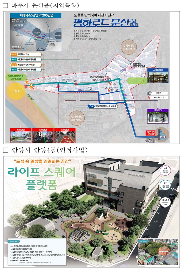 이번 선정은 12월 5일부터 12일까지 서면으로 진행된 제38차 도시재생특별위원회 심의를 거쳐 확정됐다. 경기도에서는 동두천시 생연동, 가평군 가평읍, 파주시 문산읍, 안양시 안양4동이 최종 선정됐다. 이를 통해 총 404억 원 규모의 국비를 확보했다.
