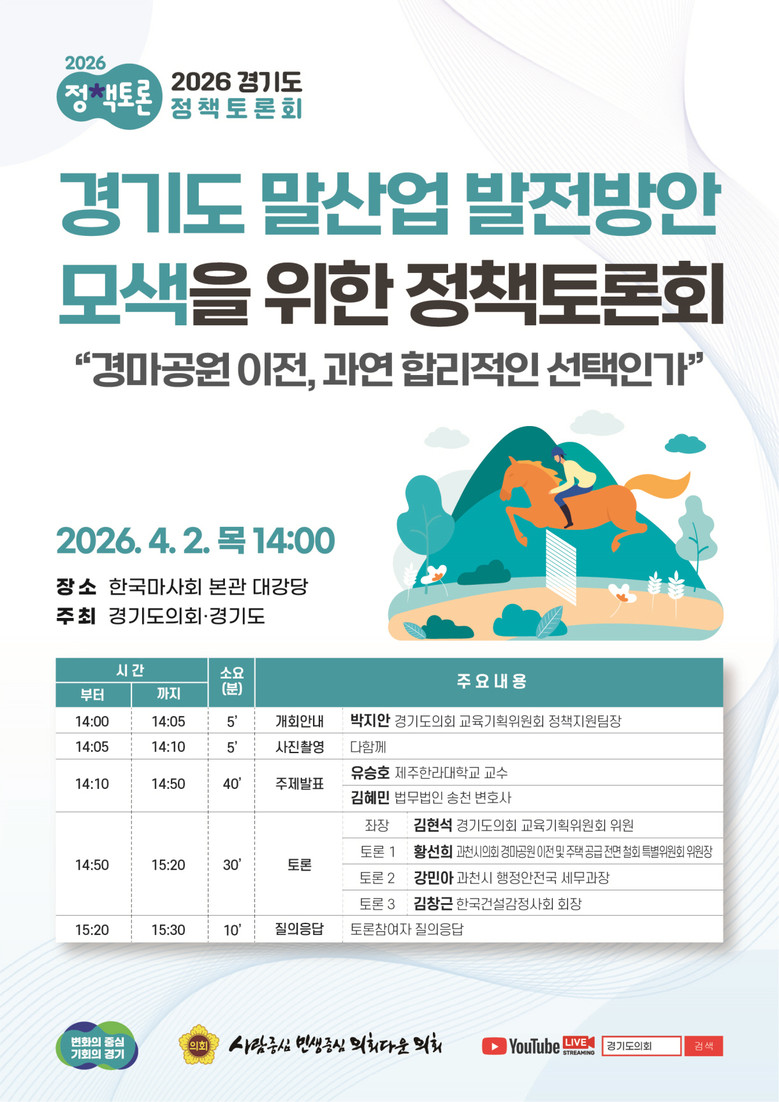 이어 “현재 약 2,400두의 말과 함께 마필관리사, 조교사, 기수, 마주, 생산 농가 등 수많은 종사자들이 이 생태계에 의존하고 있는 만큼, 경마장 이전 문제는 단순한 시설 이전이 아닌 산업 전반의 존립과 직결된 사안”이라며 “이번 토론회를 통해 말산업의 지속가능한 발전 전략과 함께 지역경제와의 상생 방안을 도출하겠다”고 밝혔다.