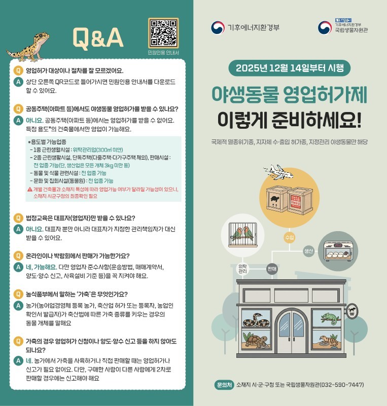 다만, 파충류·양서류만 취급할 때는 ▵판매업·수입업·생산업은 50마리 이상 보유하면서 연간 100마리 이상 판매 또는 보유 여부와 상관없이 월평균 20마리 이상 판매 ▵위탁관리업은 20마리 이상 위탁 관리하는 경우에 해당된다. 영업허가 관련 문의는 관할 시군 민원실 또는 환경부서로 하면 된다.