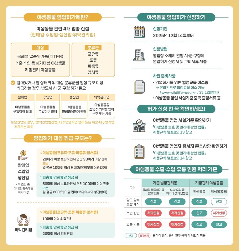 야생동물 관련 영업 허가제의 세부 내용은 국제적 멸종위기종(CITES), 수출(반출) 또는 수입(반입) 시 허가를 받아야 하는 야생동물 중 포유류, 조류, 파충류, 양서류 및 지정관리 야생동물을 일정 규모 이상으로 취급하는 업종은 관할 시.군에게 영업허가를 받아야 한다는 것이다.