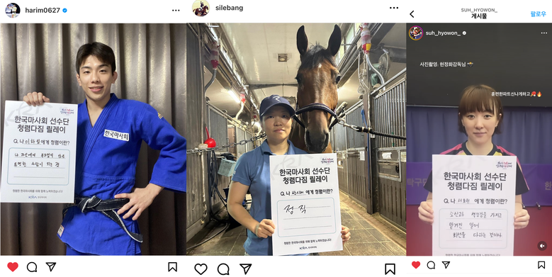 [세계타임즈 = 송민수 기자] 한국마사회(회장 정기환) 소속 유도·탁구·승마 선수단이 지난 8월 한 달간 청렴다짐 릴레이를 실시했다. 이번 행사는 청렴에 대해 높아지는 사회적 요구에 부응하고, 선수단의 실천의지를 다짐함으로써 투명한 스포츠문화를 조성하기 위해 기획됐다. 참여자가 사회관계서비스망(SNS)에 청렴실천 다짐이나 명언, 또는 본인이 생각하는 청렴이 무엇인지 작성한 후 인증사진을 올리고, 다음 주자를 지목해 이어가는 방식으로 진행됐다.
