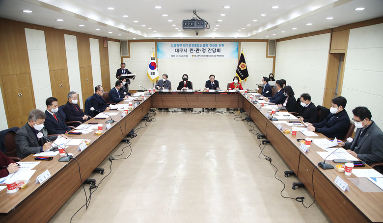 이번 간담회는 대구·경북 미래 50년이 달려 있는 대구경북통합신공항의 성공적인 건설을 위해 민(대구경북통합신공항 대구시민추진단), 관(대구시 통합신공항건설본부), 정(대구시의회 통합신공항 건설 특별위원회, 대구 동구의회 대구공항 통합이전 후적지 건설 특별위원회)이 함께 다양한 의견을 나누고자 마련됐다.