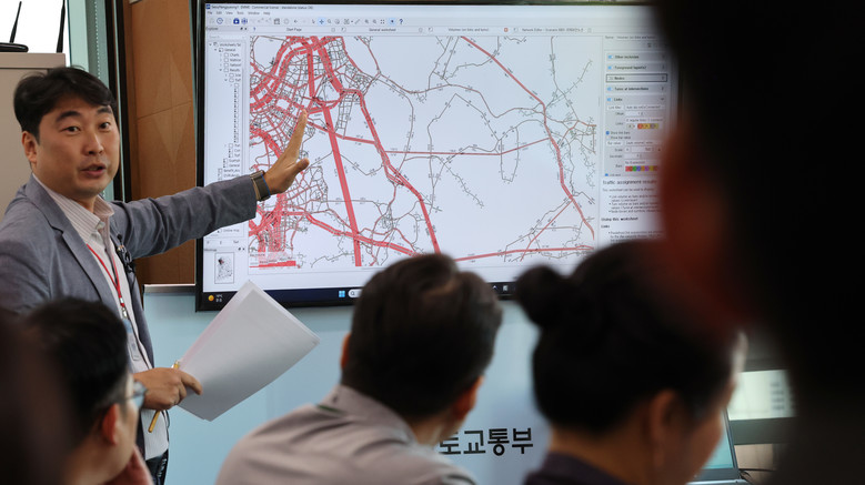 박상훈 경동엔지니어링 이사가 5일 오전 세종시 정부세종청사 국토교통부에서 열린 서울-양평 고속도로 대안노선(강상면 종점) 비용-편익(B/C) 분석 결과 브리핑에 앞서 교통량 예측분석 시연을 하고 있다. 2023.10.5