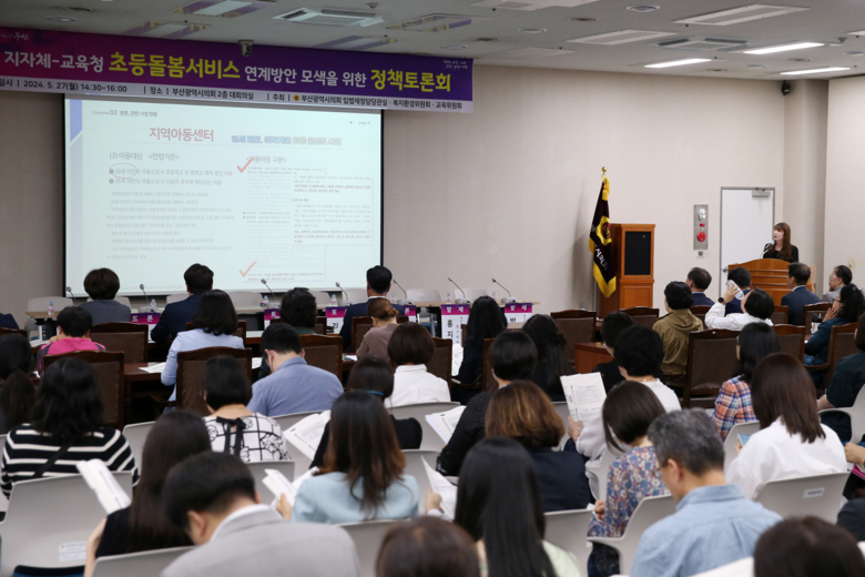 [부산 세계타임즈=이용우 기자] 올해부터 부산지역 304개 전체 초등학교에 늘봄학교가 전면 도입된 가운데, 부산시의회는 5.27.(월) 학교돌봄과 마을돌봄의 연계방안 모색을 위한 토론회를 개최했다. 이번 토론회는 지역아동센터, 다함께돌봄센터 등 ‘마을돌봄’ 관계자와 초등학교 돌봄전담사 등 ‘학교돌봄’ 관계자가 함께 지자체와 교육청 산하의 분절된 돌봄서비스 연계 방안을 논의하기 위한 자리로 마련되었다.