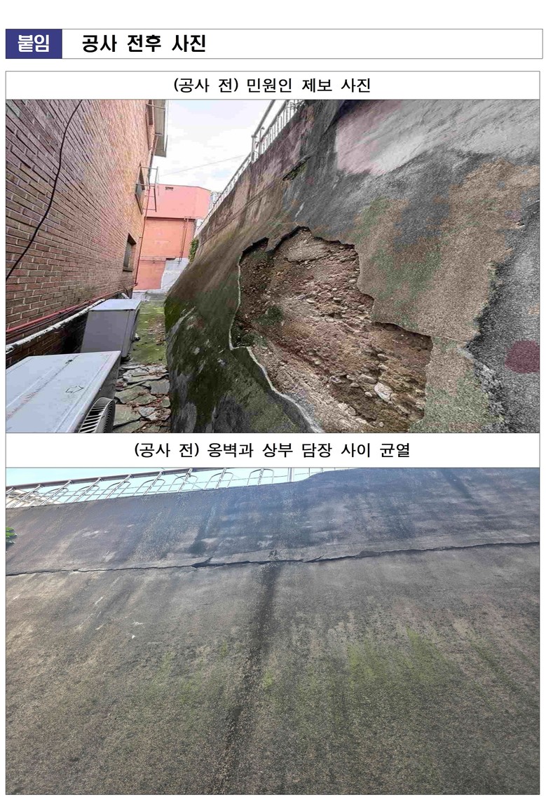 공사 후 해당 민원인은 “집 뒤편의 옹벽이 무너질까 매우 불안하였는데 교육지원청에서 빠르게 현장을 확인하고 조치해 주어서 안심이 되었다. 감사하다.”고 말을 전하며 만족감을 나타냈다.