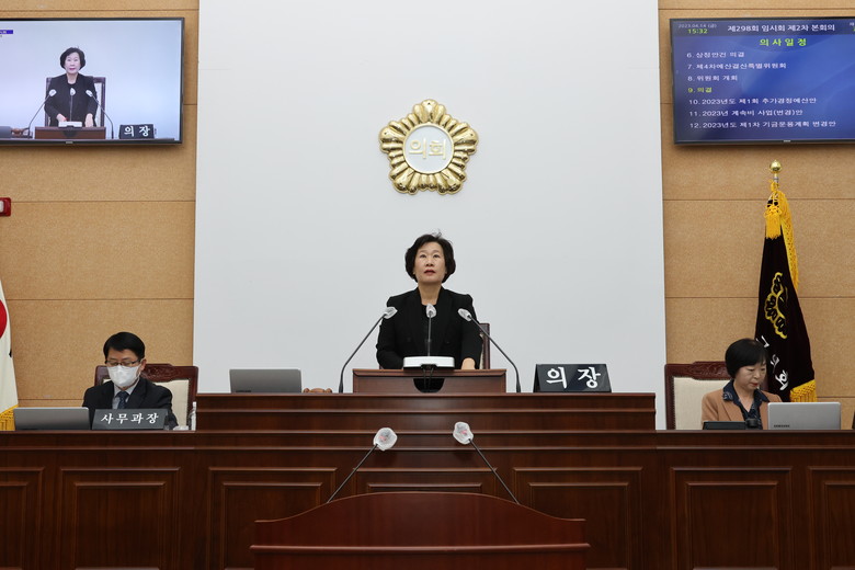 이날 2차 본회의에서 오광석 부의장은 「농가소득 증대 대책과 청년 농업인 정착을 위한 지원 촉구」에 대해 5분 발언 하였으며, 이어진 본회의에서는 각 상임위원회에 제출된 조례안 및 공유재산관리계획안과 2023년도 제1회 추가경정예산안, 2023년 계속비 사업안 등 총 16건의 안건을 처리했다.