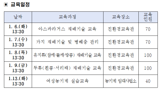 교육과정은 교육 과정은 △아스파라거스 △가지 △유지류(참깨·들깨·땅콩) △두류(흰콩·서리태) 등 여주시 주요 밭작물을 중심으로 구성되었으며, 작목별 생육 관리 요령, 병해충 대응, 안정 생산을 위한 핵심 재배기술 등을 중점적으로 다룬다.