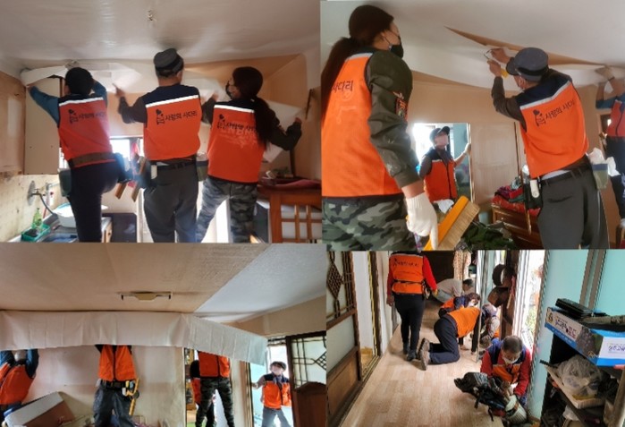 이날 봉사는 장인들 도배학원 김정자 원장을 비롯해서 회원 15명이 노후된 방 2개와 주방, 거실을 도배 및 장판 교체 봉사를 하였다.