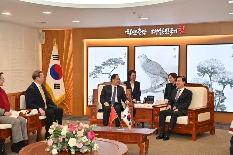 김태흠 지사는 30일 지방정부 교류회의 참석차 도를 방문한 양완밍 중국인민대외우호협회장과 만나 지방외교 협력 방안 등을 논의하고 문화·예술 교류의 시간을 가졌다.