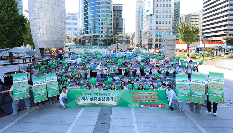 ▲28일 오전 서울 강남구 삼성역 인근에서 신천지예수교 증거장막성전 요한지파 과천교회(담임 이기원.이하 신천지 과천교회) 성도들이 ‘2024 신천지 말씀대성회 계시 성취 실상 증거’ 홍보를 위한 거리행진 후 기념 촬영을 하고 있다. [사진 제공 = 신천지 과천교회]