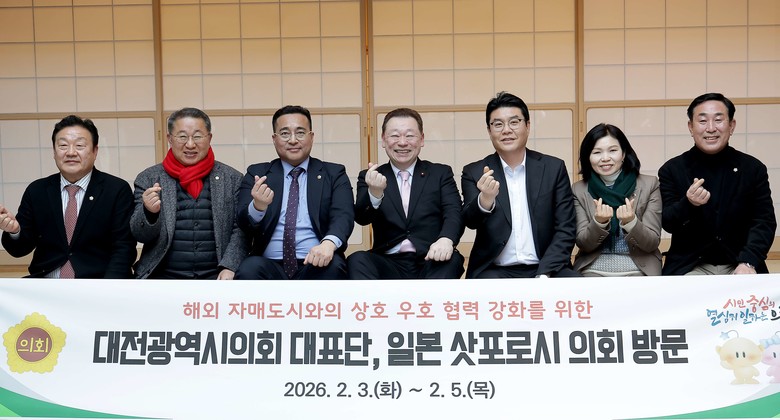한편, 일본 삿포로시의회는 오사나이 나오야 의장을 포함 총 14명으로 이뤄진 대표단을 구성해 지난해 8월 대전을 방문, 대전시의회를 접견하고 대전 0시 축제 참석, 대전한화생명볼파크 등 주요 시설 시찰, 경제세미나 등 대전과 교류의 폭을 넓힌 바 있다.