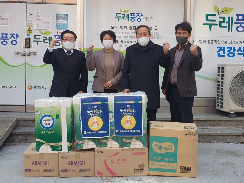 [경남 세계타임즈=최성룡 기자] 경남도의회 건설소방위원회(위원장 박해영)는 민족 대명절인 설날을 맞이하여 창원시 봉곡동에 위치하고 있는 창원시장애인종합복지관과 도계동 중증장애인생산품 생산시설인 두레풍장을 방문하여 위문품을 전달하고 관계자들을 격려했다.