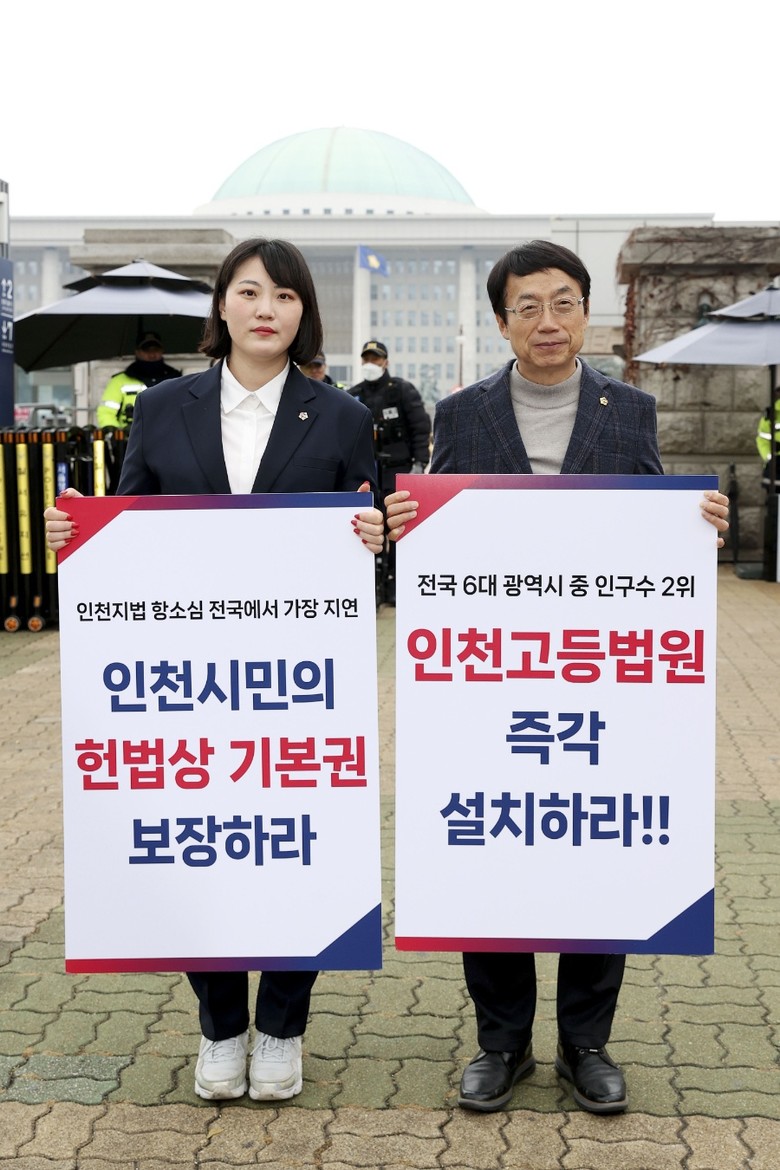 또 1인 시위에 함께 참석한 변호사 출신 이단비 의원은 “서울고등법원이 과포화로 인해 항소심 서비스를 받는 데 걸리는 시간이 전국 평균 7개월인 것에 반해 인천은 평균 10개월이 소요돼 전국에서 가장 지연되고 있다”며 “인천연구원의 연구 결과에 따르면 인천시는 사법 서비스 수요가 지속해서 증가하는 추세이고, 인천고등법원이 설치되면 서울고등법원에 과도하게 편중된 수요가 분산돼 인천을 포함한 수도권 서부권 지역의 사법 접근성이 크게 개선될 것”이라고 강조했다.