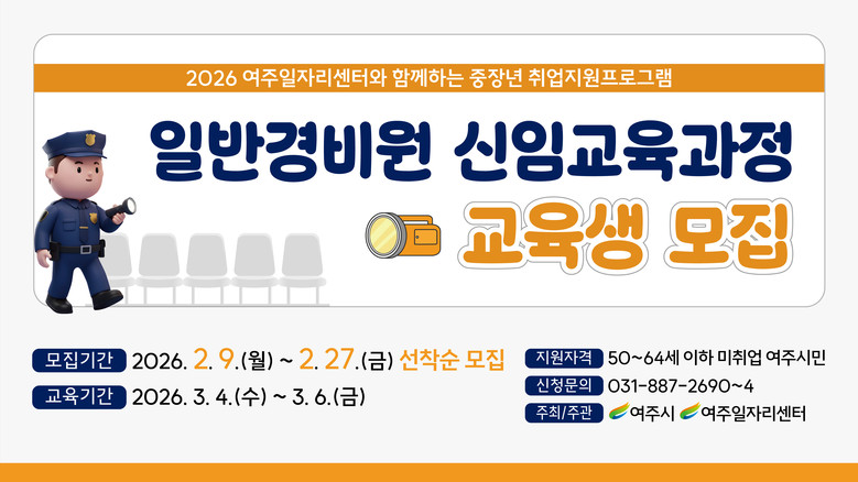 맞춤형 취업지원 프로그램의 일환으로 실시하는 일반경비원 신임교육과정은 50세부터 64세 이하의 미취업 여주시민을 대상으로 하며, 총 12명을 선착순 모집으로 모집 기간은 2월 9일부터 2월 27일까지다.