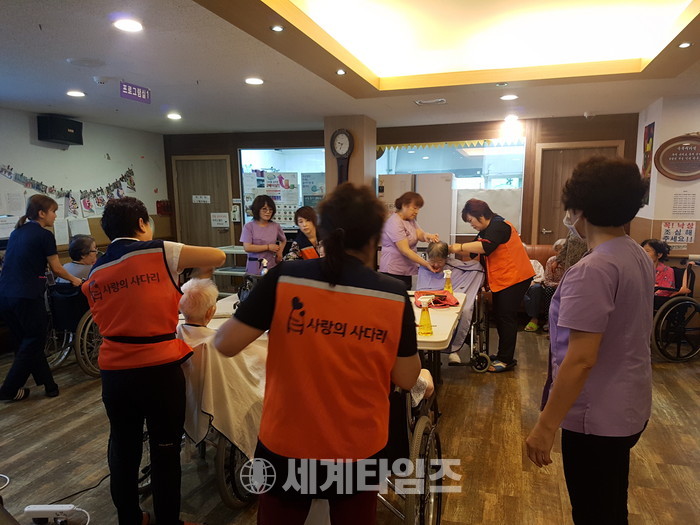 [대전=세계타임즈 이장성 기자] 5천명의 회원들이 활동하는 자발적인 SNS봉사 밴드인 사랑의 사다리 밴드(리더 이정제)는 6일 오전 10시 대전광역시 대덕구 비래동에 위치한 예사랑 실버케어 요양원(원장 김숙희)에서 치매 및 와상 어르신들 60분께 미용봉사로 훈훈한 이웃사랑을 전했다.