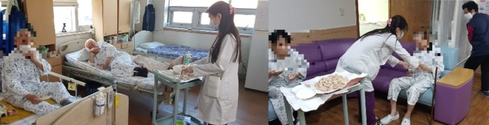세명요양병원 김석희 이사장은 ”오늘 사랑의 사다리 밴드 봉사단체에서 맛있는 통닭을 지원해주어서 큰 힘과 위안이 된다.“면서 감사함을 전했다.