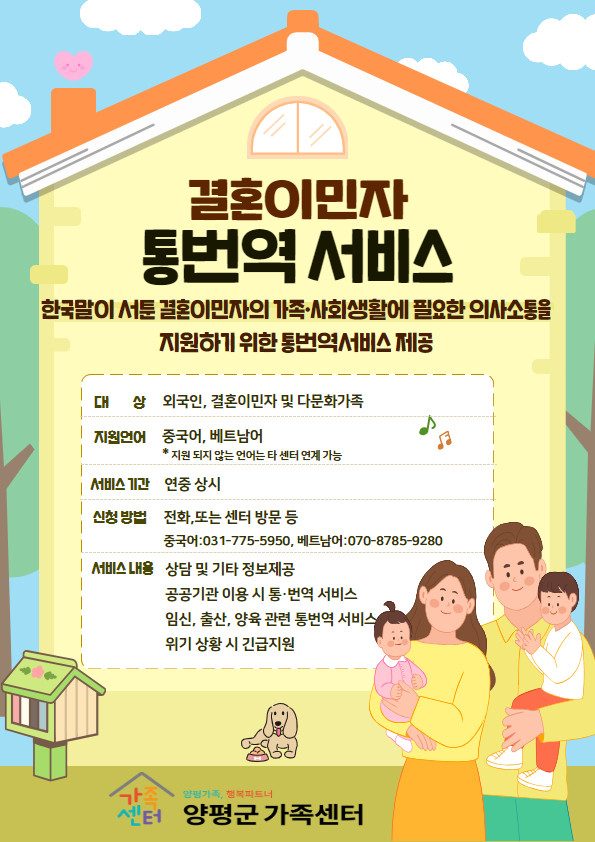 한편, 결혼이민자 통·번역 서비스 신청 및 지원사항, 한국 정착 관련 초기상담 등은 양평군가족센터로 전화 문의하면 자세한 안내를 받을 수 있다.