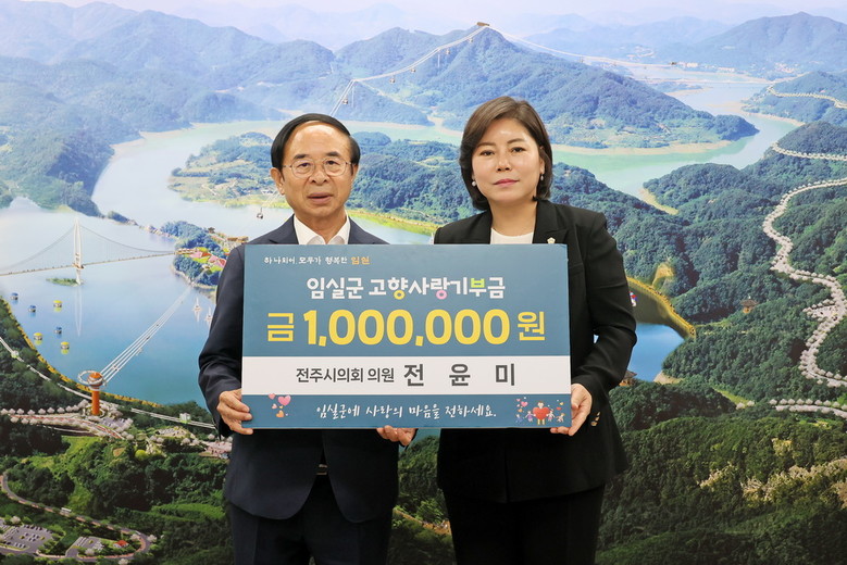 [세계타임즈 =임실군 신승민 기자] 전주시의회 전윤미 의원(효자 2.3.4동)이 지난 7일 임실군에 고향사랑기부금 100만원을 기부했다.