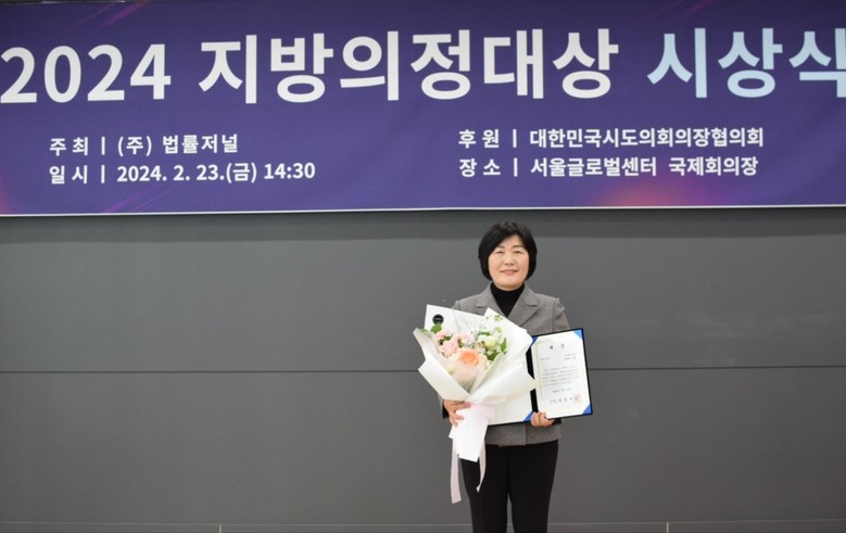 [부산 세계타임즈=이용우 기자] 부산광역시의회 기획재경위원 배영숙 의원(부산진구4, 국민의힘)이 지난 23일 법률저널이 주최하고 대한민국시도의회의장협의회가 후원한 ‘2024 지방의정대상’에서 영예의 대상을 수상했다.