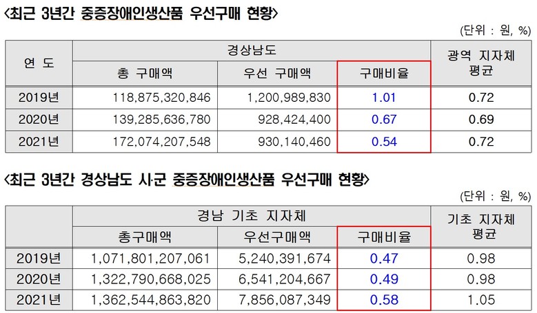 첫 번째로, 경상남도의 중증장애인생산품 우선구매 비율이 0.54%로 광역지자체 중 10위로 하위권임을 지적했다. 지난 2019년 경상남도는 우선구매 비율 1%를 달성한 바 있으나, 2021년 0.54%로 절반수준으로 하락했으며, 경상남도 시.군 역시 0.58%로 기초자치단체 평균 1.05%에 비해 절반수준에 그치고 있다.
