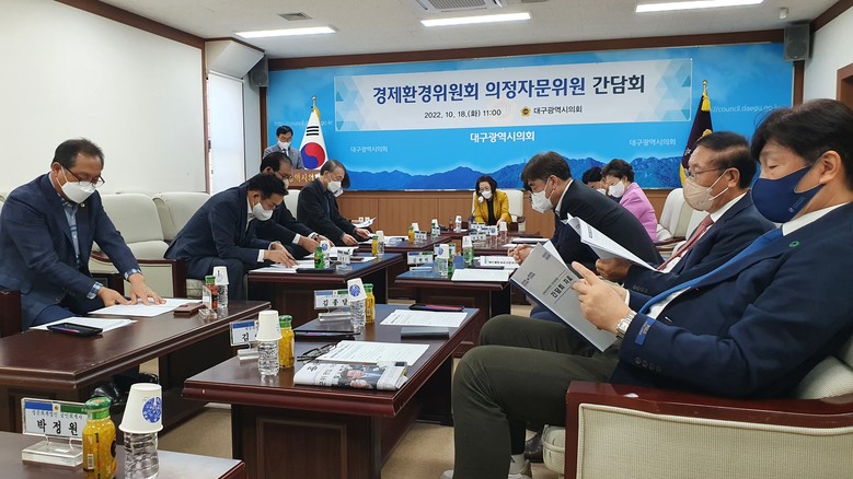 [대구 세계타임즈=한성국 기자] 대구광역시의회 경제환경위원회(위원장 이태손)는 행정사무감사와 내년도 예산심사를 앞두고 10월 18일(화) 11시 대구시의회에서 경제‧산업‧환경분야 등 외부전문가로 구성된 의정자문위원과 간담회를 개최하여 시정의 주요 현안에 대한 전문가 의견을 청취하고 함께 토론하는 시간을 가졌다.