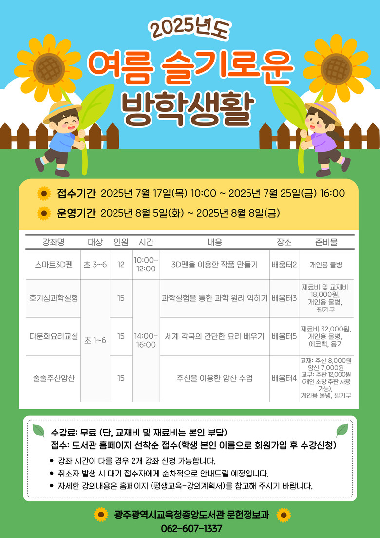 김정희 광주중앙도서관장은 “여름방학을 맞아 초등학생들이 도서관에서 다양한 체험 프로그램에 참여하며 즐겁고 유익한 시간을 보내길 바란다”고 말했다.