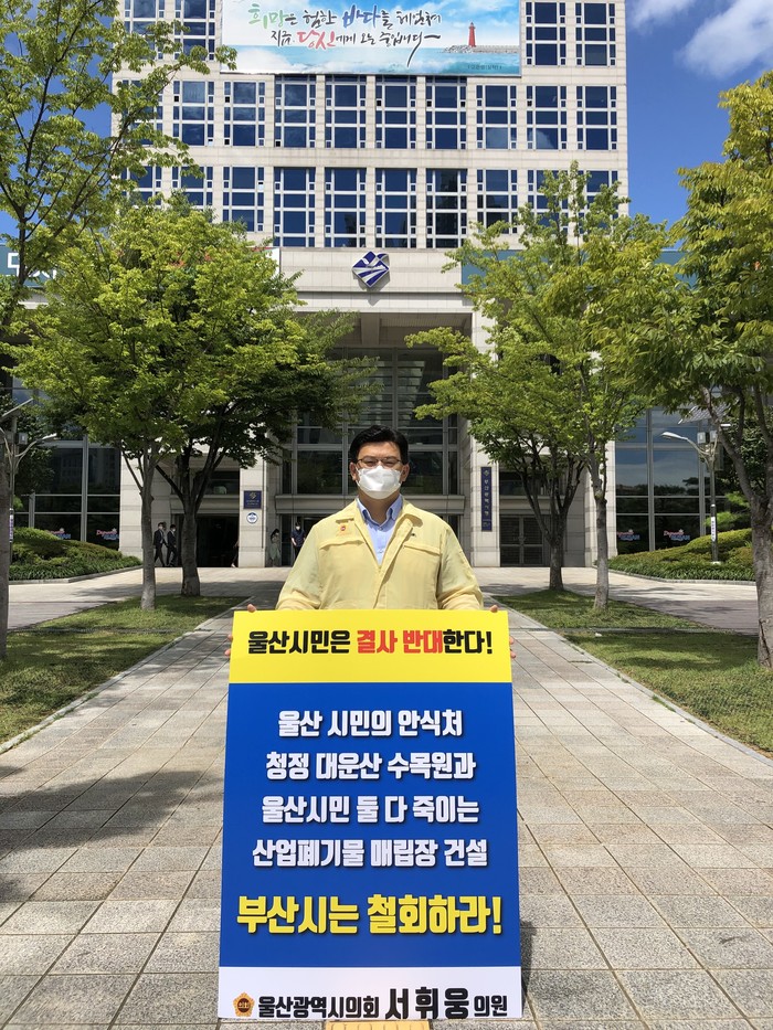 [울산=세계타임즈 이호근 기자] 울산광역시의회 서휘웅 의원은 9일 오전 부산시청 앞에서 부산시의 기장군 장안읍 산업폐기물 매립장 사업계획 승인을 반대하는 1인 시위에 나섰다.