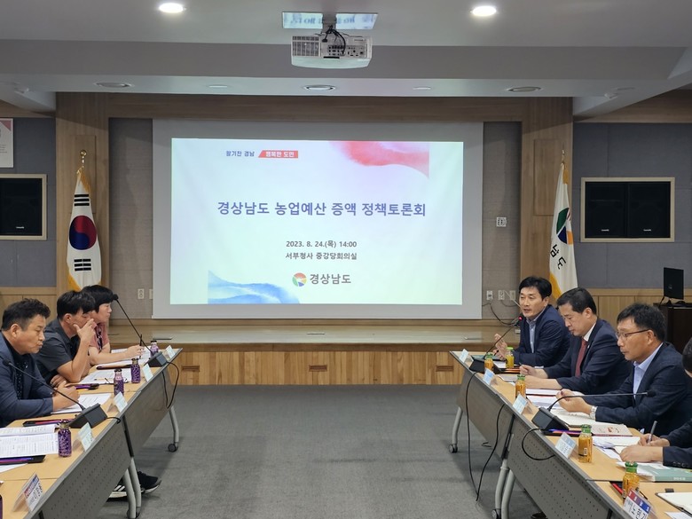 [경남 세계타임즈=최성룡 기자] 경상남도와 경상남도농어업인단체연합회가 개최한 ‘경남도 농업예산 증액 정책 토론회’가 24일 오후 경상남도청 서부청사에서 경남도의회 농해양수산위원회 위원들과 경상남도 농정국, 6개의 농업인단체가 참석한 가운데 진행됐다.