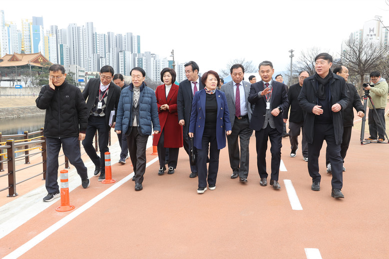현장을 찾은 경제환경위원회 위원들은 올해 여름 개장을 목표로 공사가 한창인 사계절 물놀이장 공사현장과 1단계 사업이 마무리 되어가는 ‘푸른 신천숲’ 조성지를 점검하고, 신천변을 도보로 이동하며 보행환경 개선 사업의 성과를 확인했다.