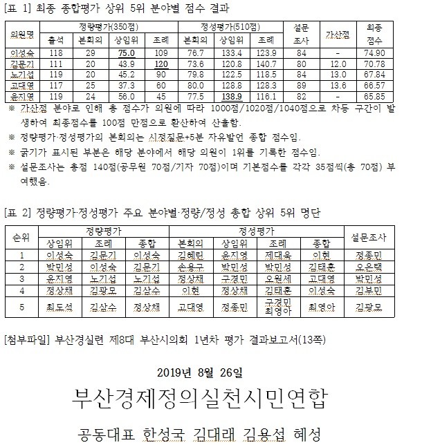 [부산=세계타임즈 장경환 기자] 부산경실련이 제8대 부산시의회 1년차 의정평가를 실시한 결과를 발표했다. 종합 상위권 의원은 1위인 이성숙 의원(74.90점), 2위 김문기 의원(70.78점), 3위 노기섭 의원(67.84점), 4위 고대영 의원(66.57점), 5위 윤지영 의원(65.85점) 순이다. 종합평가는 정성평가와 정량평가, 가점으로 구성되어 있는데 의원 46명의 전체 평균은 100점 기준에 54.87점으로 나타나 시의원들의 의정활동이 개선될 필요가 있는 것으로 나타났다.
