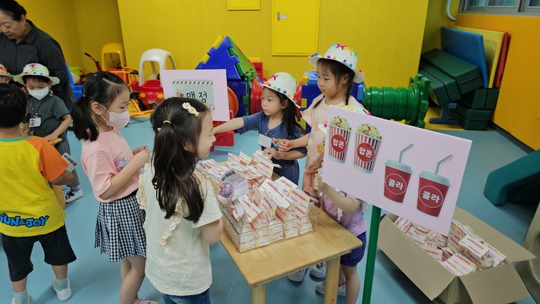 유아들이 입장권과 자리, 영화 포스터, 영화관 뽑기, 팝콘 등 영화관에서 경험한 것이나 해보고 싶었던 것들을 녹여내어 새싹영화관이 만들어졌다. 1학년에게 초대를 하고 보고 싶은 영화도 추천을 받아 선정해 실제와 비슷한 영화관 모습을 갖추고 영화관 놀이를 진행하였다.