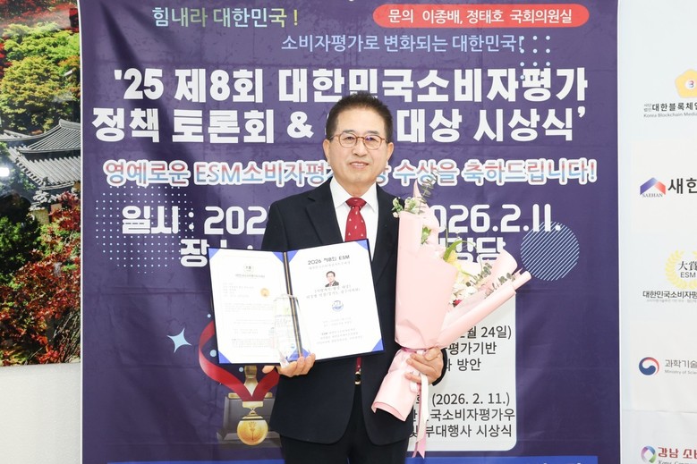 [광주시 세계타임즈=송민수 기자] 지난 11일(수), 국회 도서관에서 열린 2026 제8회 ESM대한민국소비자평가우수대상 정책토론회 및 시상식에서 광주시의회 허경행 의장이 지방자치/행정 부문 대상을 수상했다.