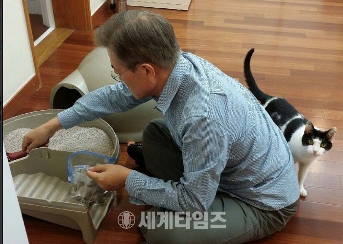 문재인 대통령이 경남 양산 사저에서 길러온 반려견인 풍산개 '마루'가 청와대에 입성해 '퍼스트 도그'가 됐다. 문 대통령은 27일 오후 트위터를 통해 찡찡이의 화장실을 치우는 사진과 함께 "찡찡이에 이어 마루도 양산 집에서 데려왔습니다. 이산가족들이 다시 모였습니다. 찡찡이는 아직 장소가 낯설어 바깥 출입을 잘 못합니다. 대신 내가 TV 뉴스를 볼 때면 착 달라붙어 떨어지려하지 않습니다"고 올렸다. 2017.05.27.(사진=문재인 대통령 트위터)