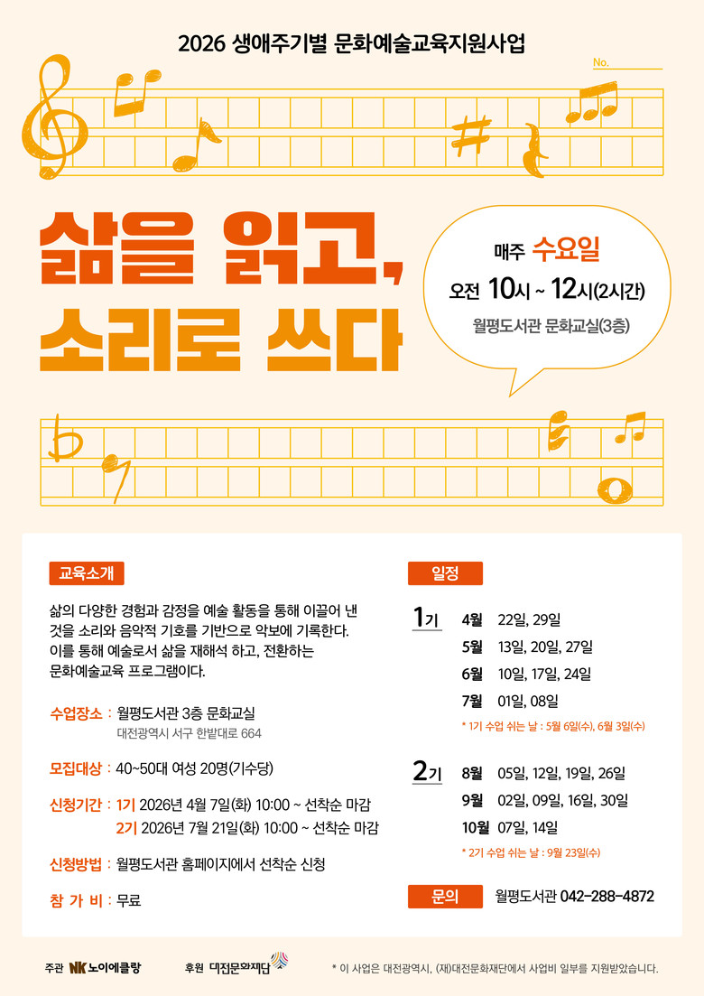 이번 프로그램은 도서관이라는 인문학적 공간에 음악적 감성을 결합해, 개인의 삶의 이야기를 예술적 결과물로 확장하는 데 초점을 맞췄다. 대전문화재단의 ‘생애주기별 문화예술 교육 지원사업’에 선정된 사업으로, 지역 예술단체 ‘노이에끌랑’, ‘아트비타’와 협력해 전문적인 교육과정을 제공한다.