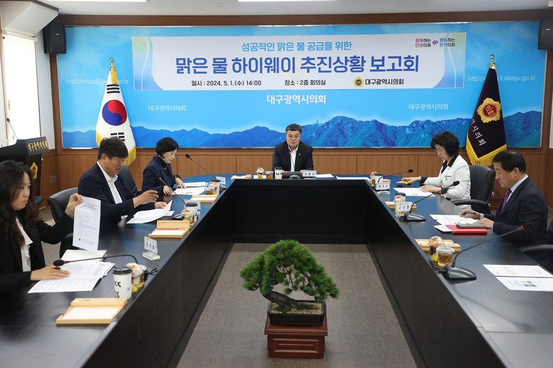 [대구 세계타임즈=한윤석 기자] 대구시의회 맑은물공급추진특별위원회(위원장 김원규)는 5월 1일(수) 시의회 2층 간담회장에서 ‘맑은 물 하이웨이’ 사업 추진 상황을 점검하고 성공적인 맑은 물 공급 방안과 협력 사항을 모색하기 위해 집행부와 간담회를 가졌다.