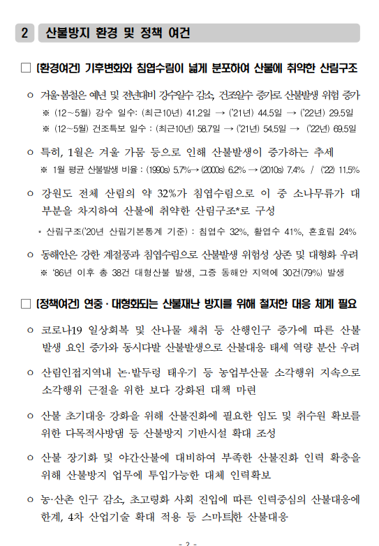 최근 10년간(’13∼’22) 산불발생 현황을 분석한 강원소방본부 자료에 의하면, 산불은 상반기에 집중 발생(전체 84.5%)하고, 3~5월에 최다 발생한 것으로 나타났다.
