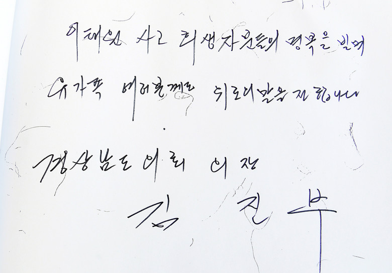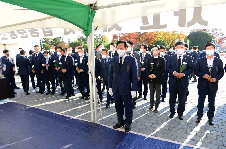 경남도청 정문 앞에 마련된 합동분향소에 방문한 김 의장은 우선 참배록을 작성하고 경남도의회를 대표하여 분향 후 참석한 도의원과 함께 묵념을 했다.