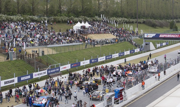 [사진설명] 에버랜드 스피드웨이에서 열린 2018 CJ대한통운 슈퍼레이스 챔피언십 4라운드 경기 당시 그리드워크 행사에 참가한 관람객들이 서킷을 가득 메우고 있다.