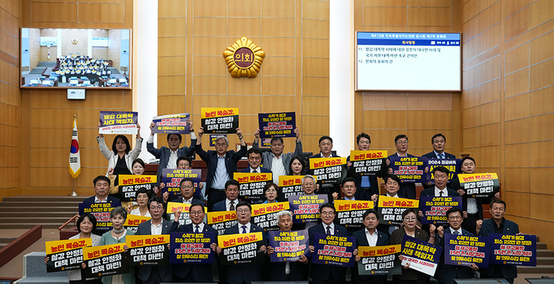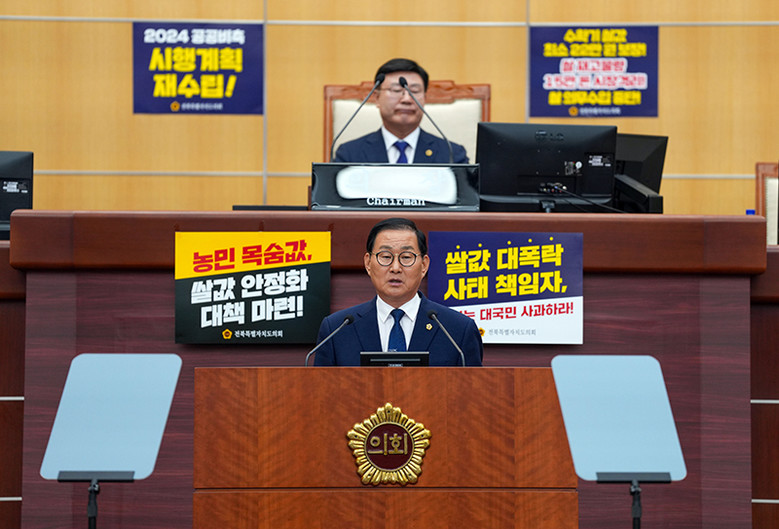 [전북특별자치도의회=세계타임즈 이상호 기자] 전북특별자치도의회 임승식 의원(정읍1ㆍ더불어민주당)이 제413회 임시회 제1차 본회의에서 ‘쌀값 대폭락 사태에 대한 정부의 대국민 사과 및 국가 차원 대책 마련 촉구 건의안’을 대표 발의했다.