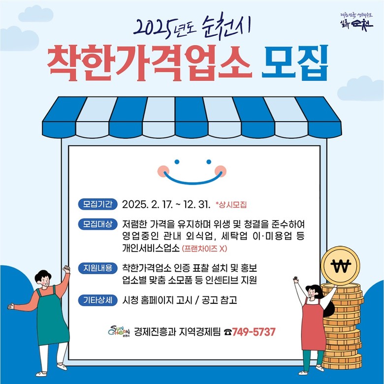 모집 대상은 순천시에서 저렴한 가격을 유지하면서도 위생과 청결을 준수하는 6개월 이상 영업 중인 외식업, 이·미용업, 세탁업 등 개인서비스업소이다.