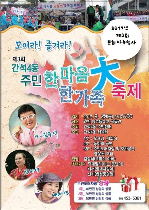 [남동구=세계타임즈 심동윤 기자] 인천 남동구 간석4동(동장 황주헌)이 오는 29일 오후 5시부터 인천남고등학교 체육관에서 ‘2017년 문화나눔행사 주민 한마음한가족 大축제’를 개최한다.