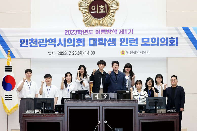 인천시의회(의장 허식)는 25일 시의회 본회의장에서 대학생 인턴 10명이 참여한 가운데 ‘2023학년도 여름방학 제1기 대학생 인턴 모의의회’를 개최했다.