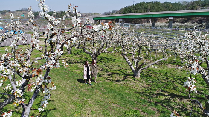 충북 영동군 과일나라테마공원의 봄햇살 가득담긴 배꽃이 순백의 우아한 자태를 뽐내며 상춘객들을 유혹하고 있다.