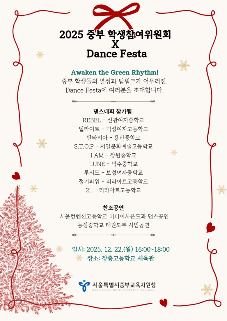 「중부 학생참여위원회 X 댄스 페스타」는 2025년 하반기 중부 학생참여위원회 리더십캠프에서 학생들이 제안한 여러 아이디어 중 하나로, 2025 중부 교육장배 학교스포츠클럽대회와 연계하여 학생이 중심이 되는 축제의 장을 만들어보자는 취지에서 추진되었다. 단순한 경기 관람이나 부대행사에 머무르지 않고, 학생들이 직접 기획과 운영에 참여하여 참여·소통·존중의 학생자치 가치를 실천하는 축제형 프로그램으로 구성된 것이 특징이다.