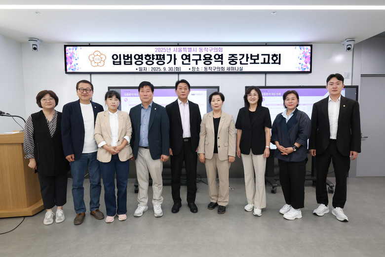 [동작구 세계타임즈=이장성 기자] 동작구의회(의장 정재천)는 30일 의회 세미나실에서 그간 입법영향평가 위원회를 중심으로 추진한 ‘입법영향평가 연구 용역’ 추진상황 중간보고회를 개최했다.